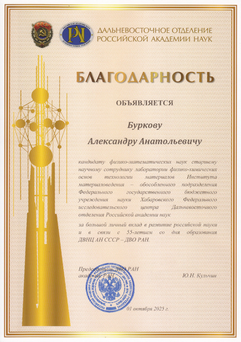 20 ноября 2025 г. В связи с 55-летием со дня образования ДВНЦ АН СССР – ДВО РАН за большой личный вклад в развитие российской науки благодарность объявлена к.ф.-.м.н., заведующему лаборатории физико-химических основ технологии материалов Буркову А.А., за многолетний добросовестный труд и высокий профессионализм почетной грамотой награжден к.т.н., заведующий лаборатории порошковой металлургии Дворник М.И.