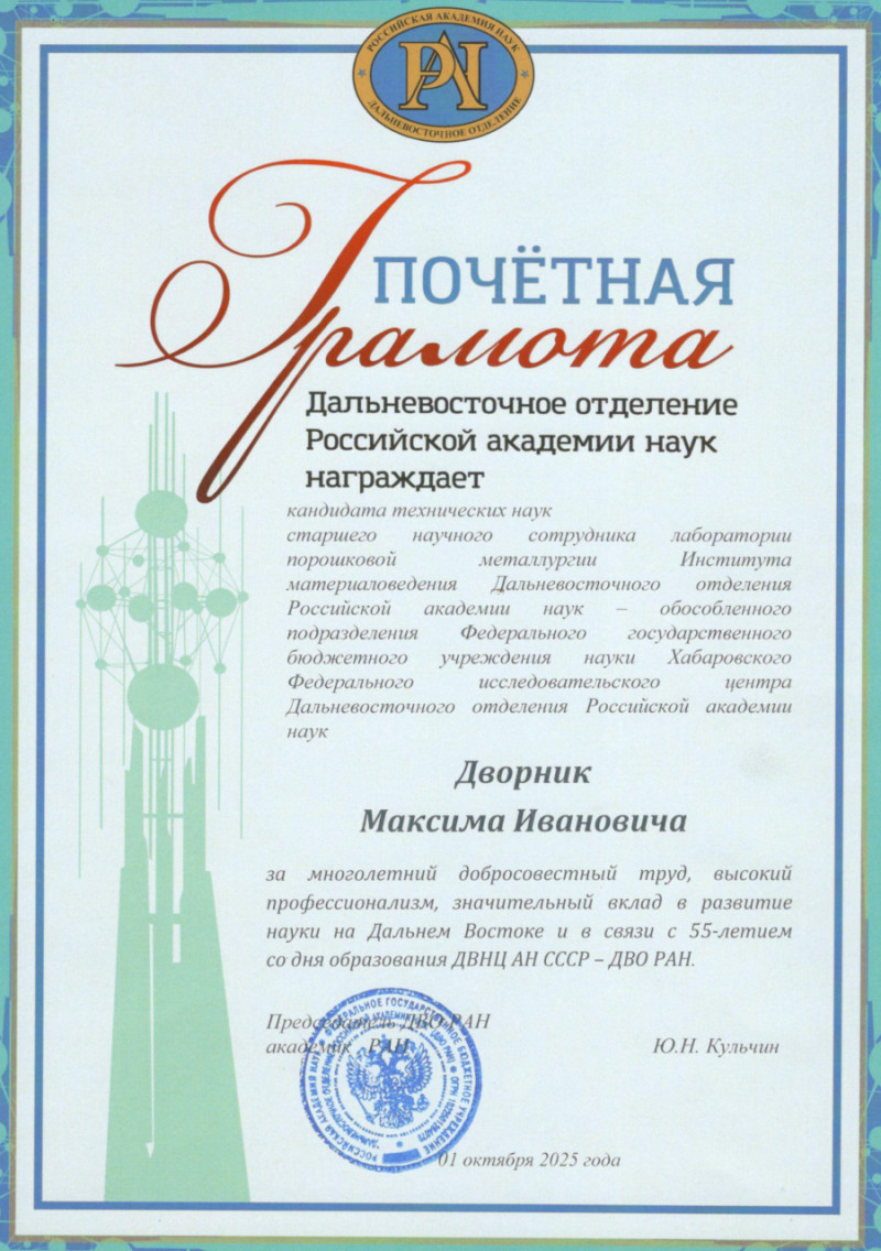 20 ноября 2025 г. В связи с 55-летием со дня образования ДВНЦ АН СССР – ДВО РАН за большой личный вклад в развитие российской науки благодарность объявлена к.ф.-.м.н., заведующему лаборатории физико-химических основ технологии материалов Буркову А.А., за многолетний добросовестный труд и высокий профессионализм почетной грамотой награжден к.т.н., заведующий лаборатории порошковой металлургии Дворник М.И.